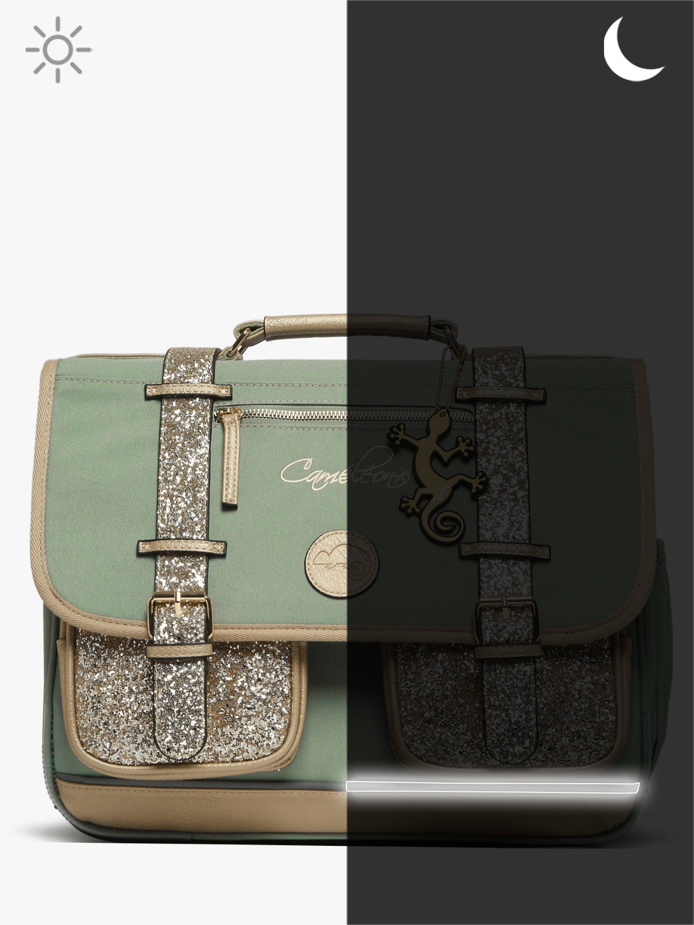 38 cm - 18 litres - 1.07 kg ~ Cartable enfant primaire 38cm de la ligne Vintage Fantasy de chez Caméléon, parfait pour le CP, CE1 et le CE2. Il se divise en deux compartiments séparés par une poche centrale zippée et peut contenir les formats cahiers A4 et 24x32cm. On retrouve à l'extérieur du cartable un emplacement pour la gourde. Pratique, il dispose de deux poches à fermeture éclair sur le devant, idéales pour un petit goûter ou l'agenda. Petit plus, ce cartable dispose d'une étiquette nom. Le fond du cartable est renforcé pour plus de solidité et des bandes réfléchissantes sont disposées autour du sac et sur les bretelles. Conçu pour le confort des enfants, le dos et les bretelles sont rembourrés. Petit plus, la règle est offerte ! Fabriqué en polyester recyclé imperméable.